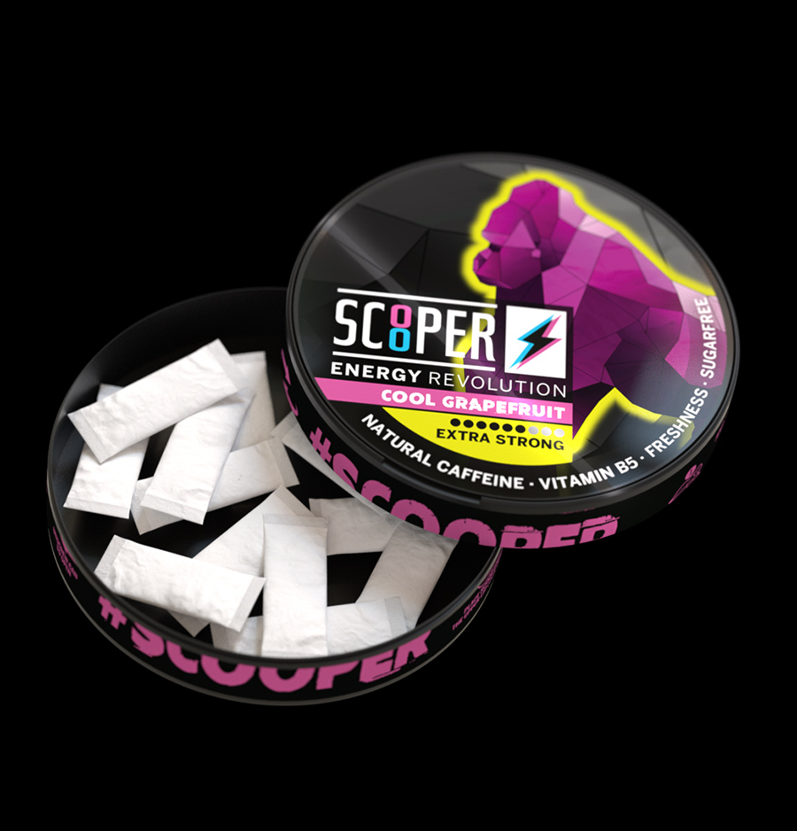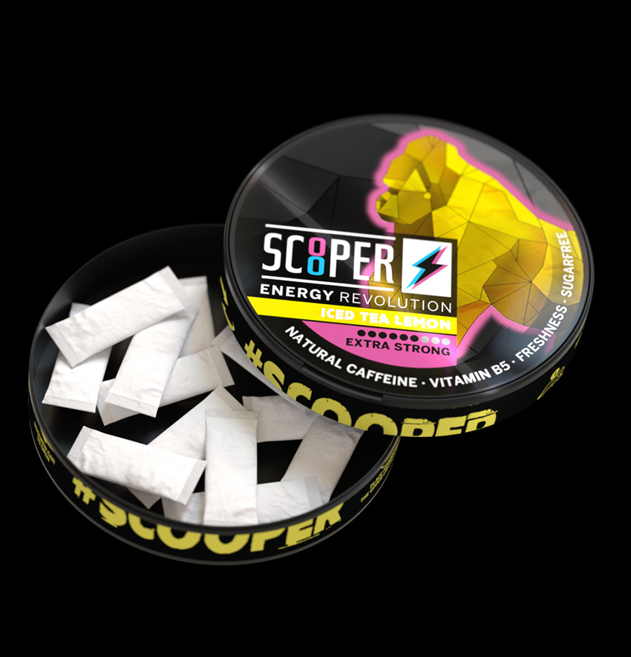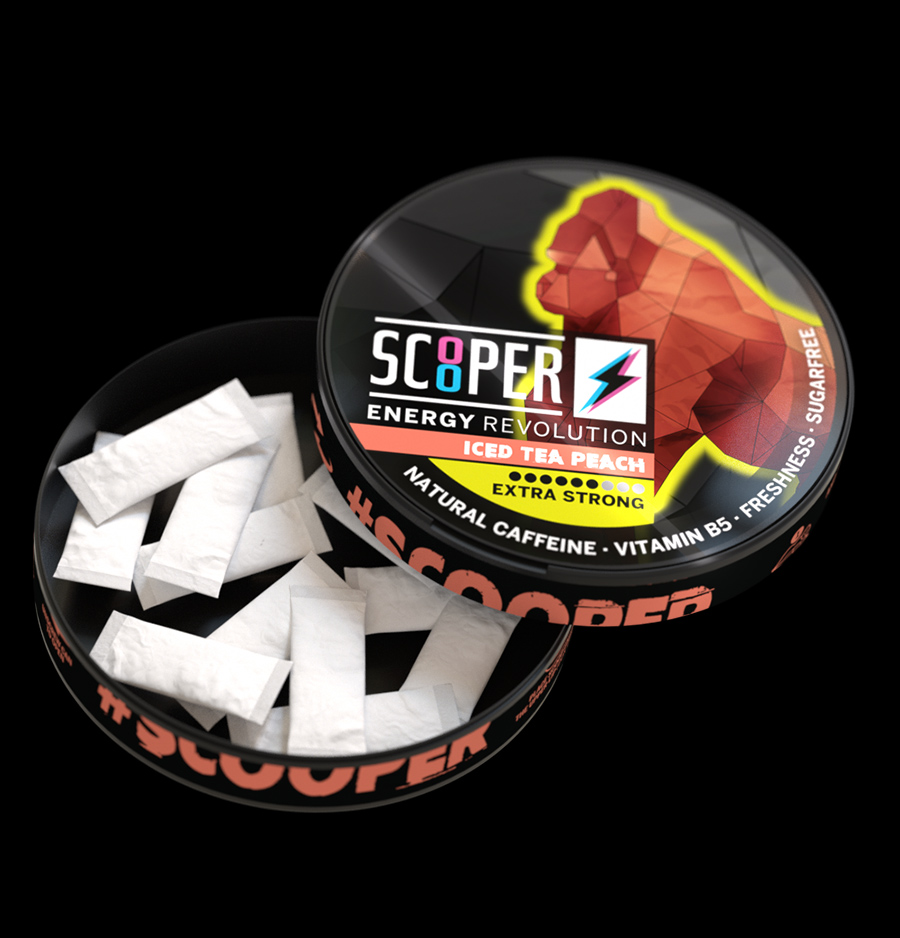 SCOOPER ENERGY Extra Strong, SCOOPER ENERGY are small sachets/pouches (snus) filled with caffeine-containing powder and enriched with vitamin B5. SCOOPER ENERGY is available in several flavors: Fresh Mint, Cool Grapefruit, Iced Cola, as well as Iced Tea Peach and Iced Tea Lemon. The sachets/pouches are packed in black plastic resealable boxes. These boxes contain 12 sachets/pouches with a net weight of 7.2 g.